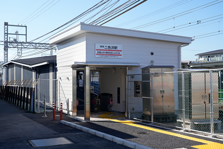 昭和8年、南海鉄道は第2の浜寺を目指して宿泊施設のある海水浴場、「海浜村」を開設した。駅は昭和11年6月に海水浴シーズンだけ営業する臨時駅として開設され、2年後に通年営業の駅に昇格した。白砂青松の美しい浜辺であったことから、砂の白、松の緑の2色をとって二色浜と名付けられた。 |